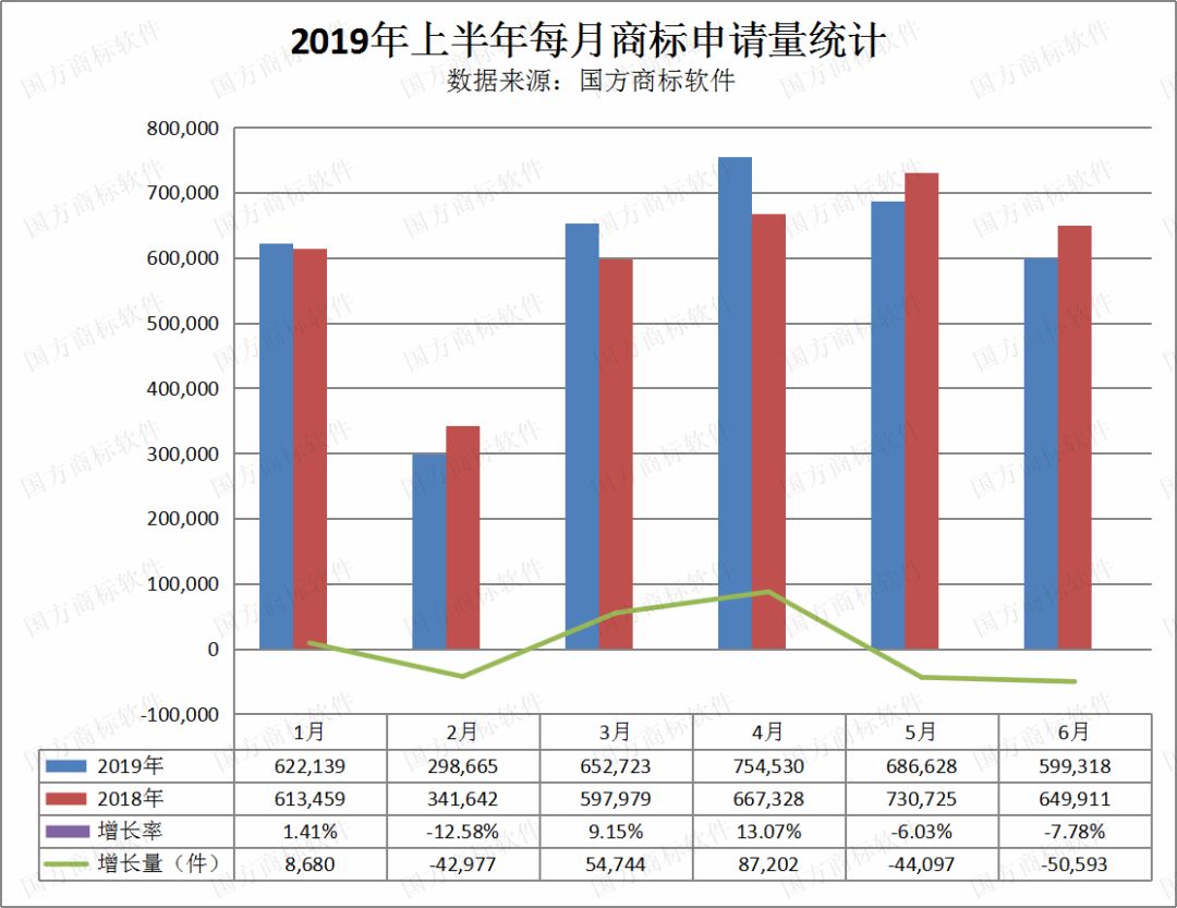 近日,国方商标软件发布“2019年上半年每月商标申请量统计表”。数据显示,2019年上半年我国商标申请量为3614003件,较2018年同期增长0.36%。