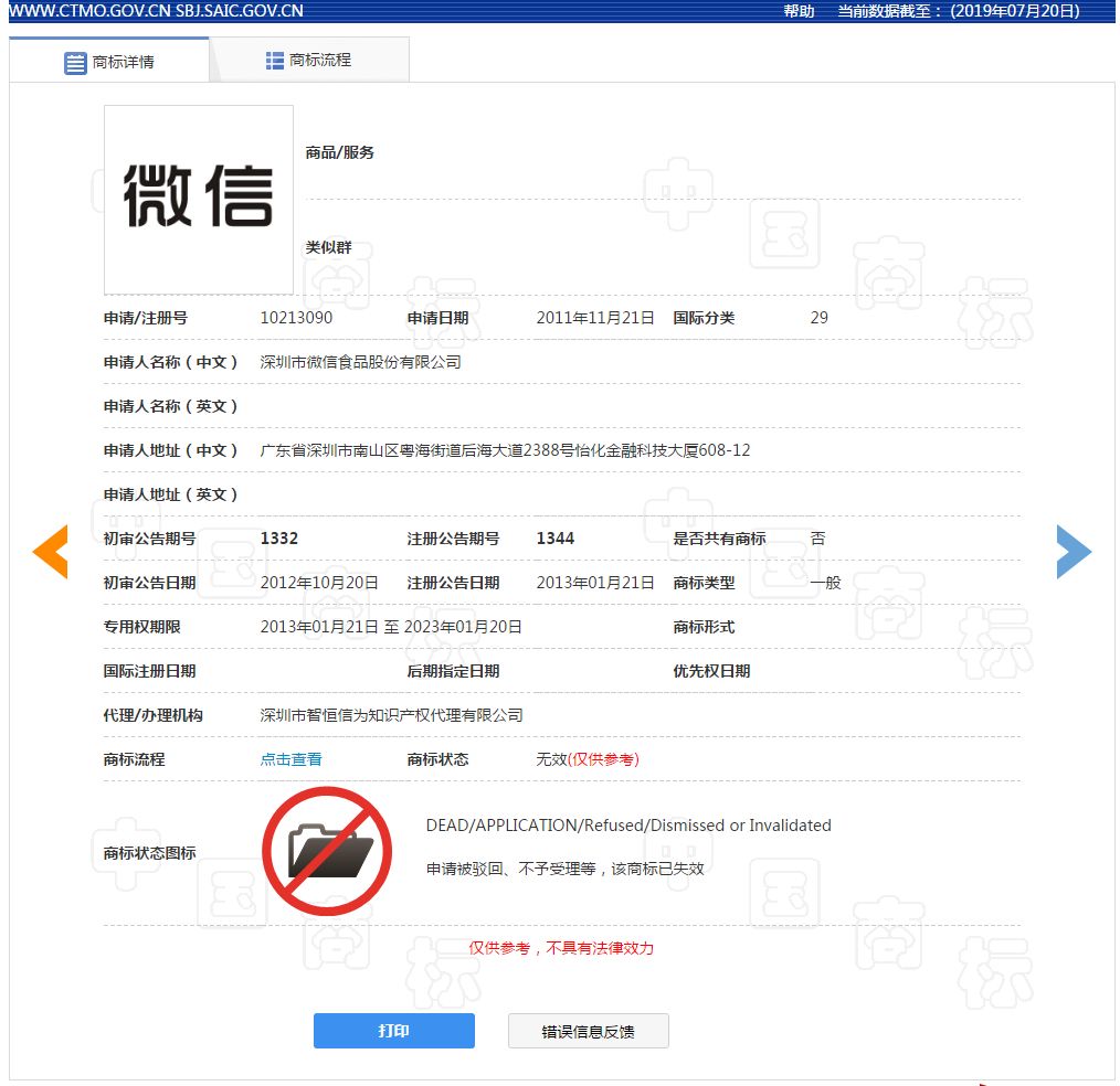 2011年1月21日微信1.0测试版发布,三天后,腾讯公司正式向商标局提交了“微信”图文商标注册申请。在这之前和在这之后,“微信”纷纷被他人注册商标,于是“微信”商标也成为腾讯的痛,时至今日,流浪在外的“微信”商标仍不在少数: