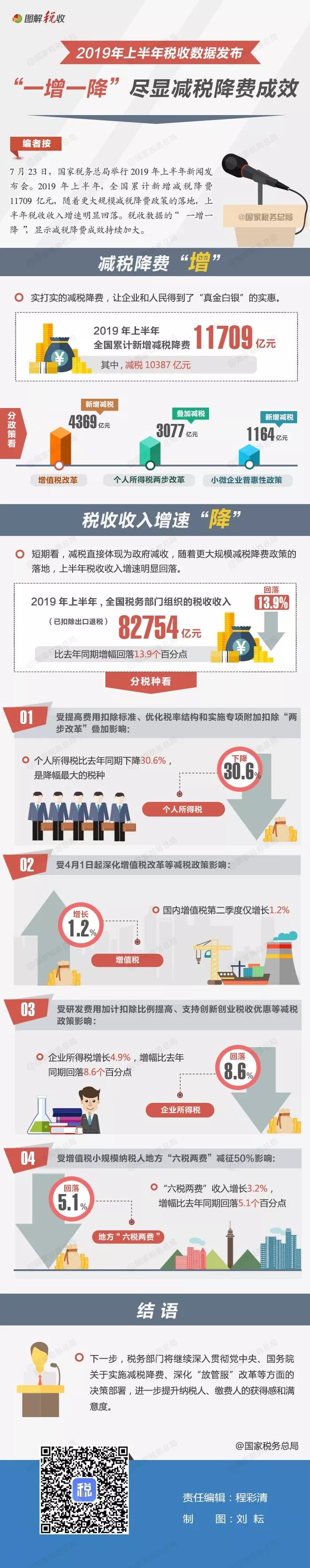 日前,国家税务总局召开2019年上半年新闻发布会。数据显示,2019年上半年,全国累计新增减税降费11709亿元。